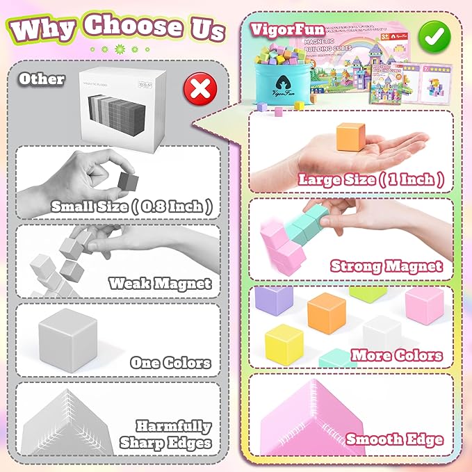 - Ultra-Safe & Durable ABS Material: Discover our safe and reliable magnetic blocks crafted from non-toxic, high-quality ABS material. They feature seamlessly smooth surfaces and rounded edges for safe handling by young builders. Built to withstand drops and bites, these durable blocks ensure worry-free, sensory-stimulating play