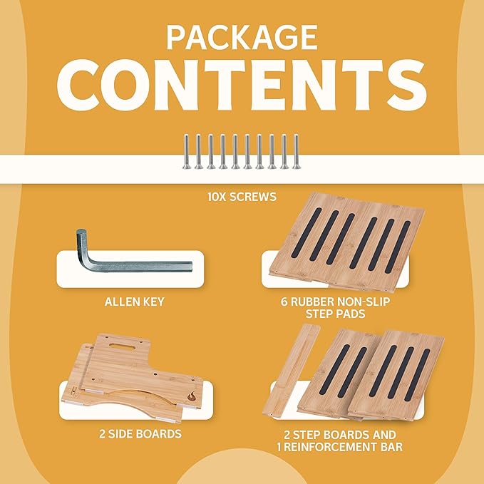 - EASILY INSTALLED - This kids step stool comes with precise pre-drilled holes, high quality screws, an Allen key, six anti-slip pads, two step boards, two outer boards, and a reinforcement bar so it's ready to use in minutes. We've included easy to follow instructions to make installation a breeze.