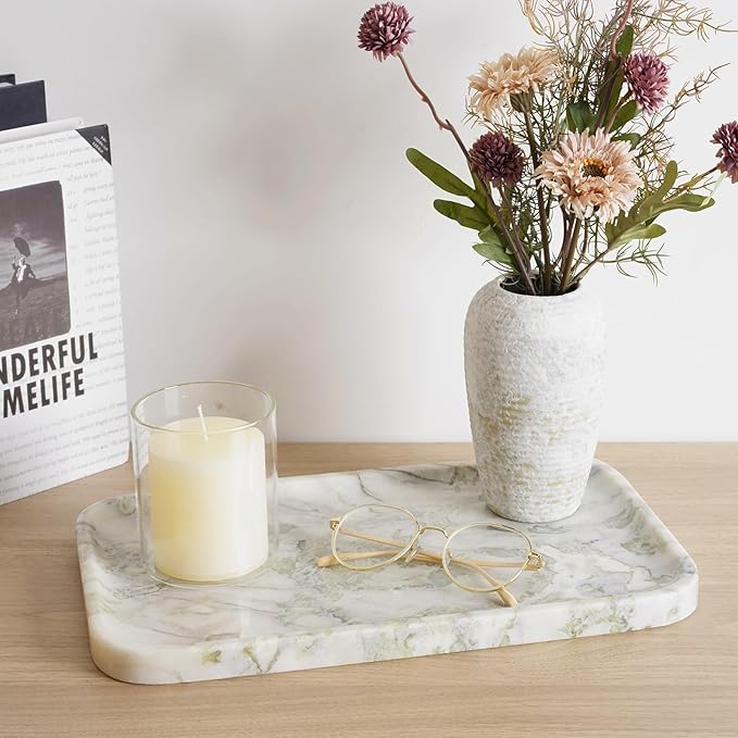 - Widely Applications: The marble bathroom tray is designed in larger sizes and are suitable for holding perfumes, candles, shampoos, jewellery even cutlery. Whether it's a kitchen, bedroom or living room countertop, the stone vanity tray fits in perfectly. Easily fits into a variety of home environments and provides convenient storage.