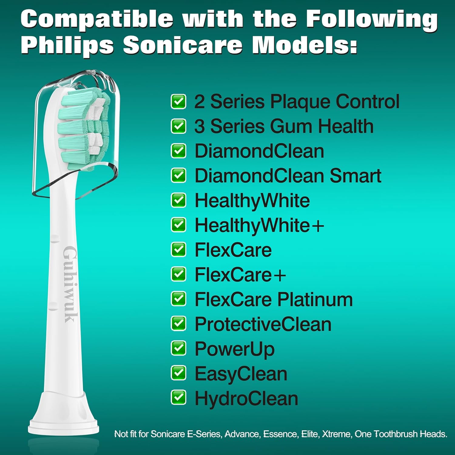 - High Compatibility: Guhiwuk toothbrush replacement heads compatible with Philips Sonicare click-on electric toothbrush handles, Fit for Phillips Sonicare 2 Series Plaque Control, 3 Series gum health, DiamondClean, DailyClean, HealthyWhite, FlexCare, EasyClean and ProtectiveClean 4100 5100 5300 6100 C1 C2 C3 G2 W electric toothbrush brush heads.