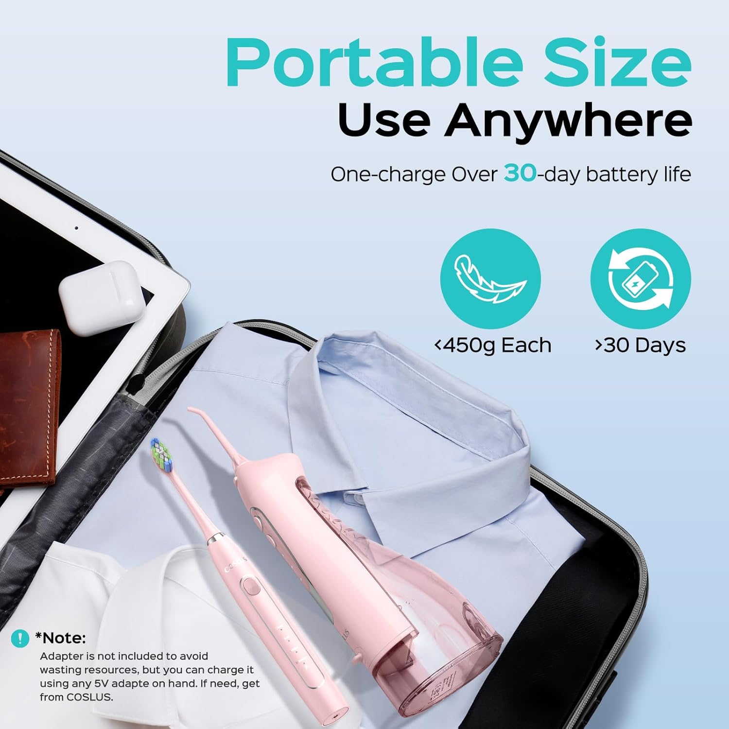 - Upgrade Battery Power for Long Travel: The portable water dental pick lasts up to 30 days, and the electric toothbrush for cleaning lasts up to 45 days. Both electric toothbrush and water flosser combo for family support USB fast charging, and weigh less than 450g. Ensuring you have fresh breath during extended trips