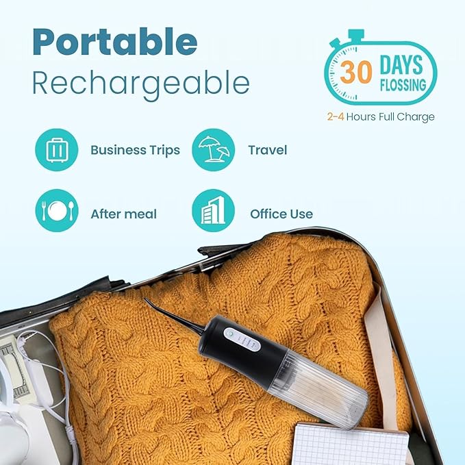 - 【🔋30-Day Cordless Runtime - Travel-Ready Design】 Ultra-portable oral irrigator with USB-C fast charging (2-4hrs full charge). One month of cordless use per charge outperforms competitors. Compact case fits in carry-ons - your perfect companion for camping/offices/dorm rooms.
