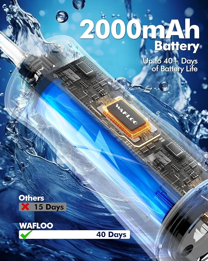 - IPX7 Waterproof: This cordless water flosser is rated IPX7 waterproof, allowing safe use in the shower and easy cleaning. The upgraded motor delivers a more effective dual-stream water flow, outperforming similar products