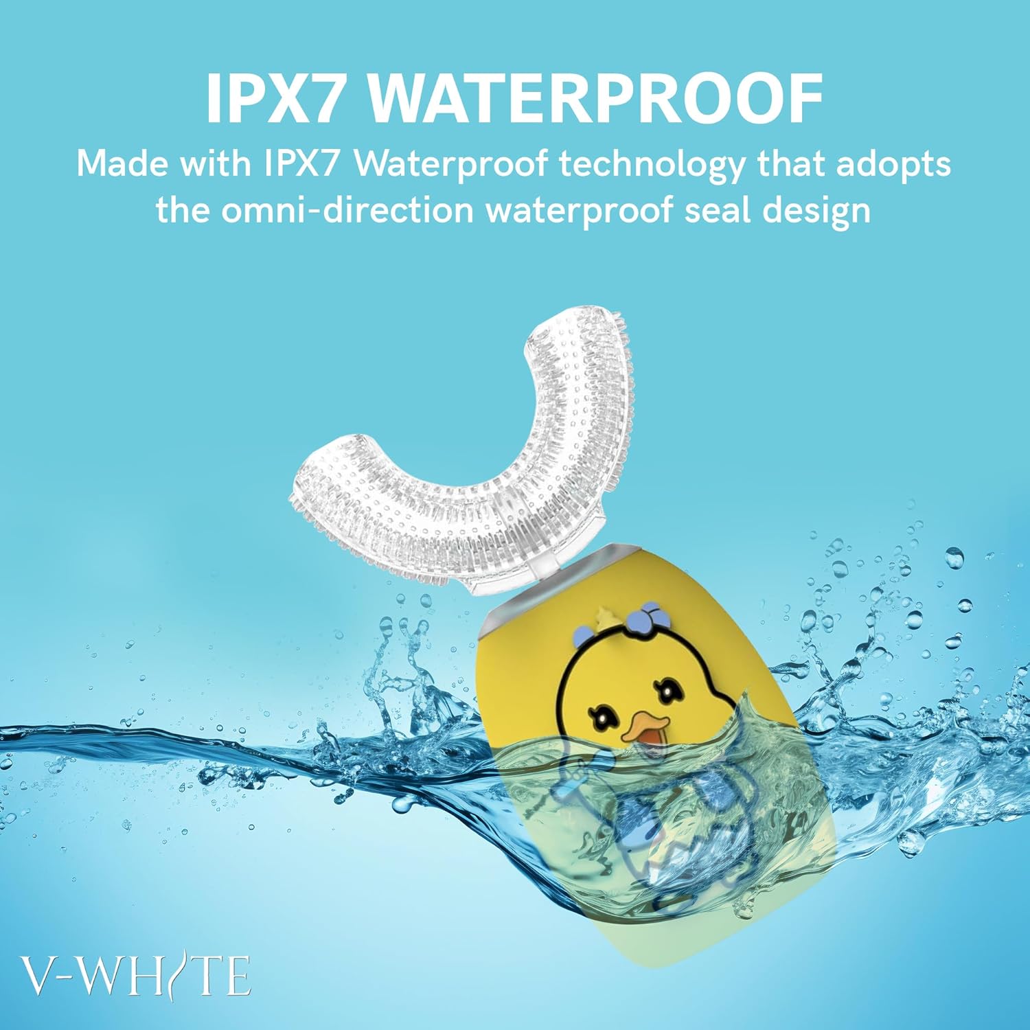- 360° Ultrasonic Cleaning – The V-White Electric Toothbrush is designed with a unique U-shaped mouthpiece that ensures a full 360° deep cleaning, reaching every corner of your child’s mouth for thorough teeth whitening and plaque removal.