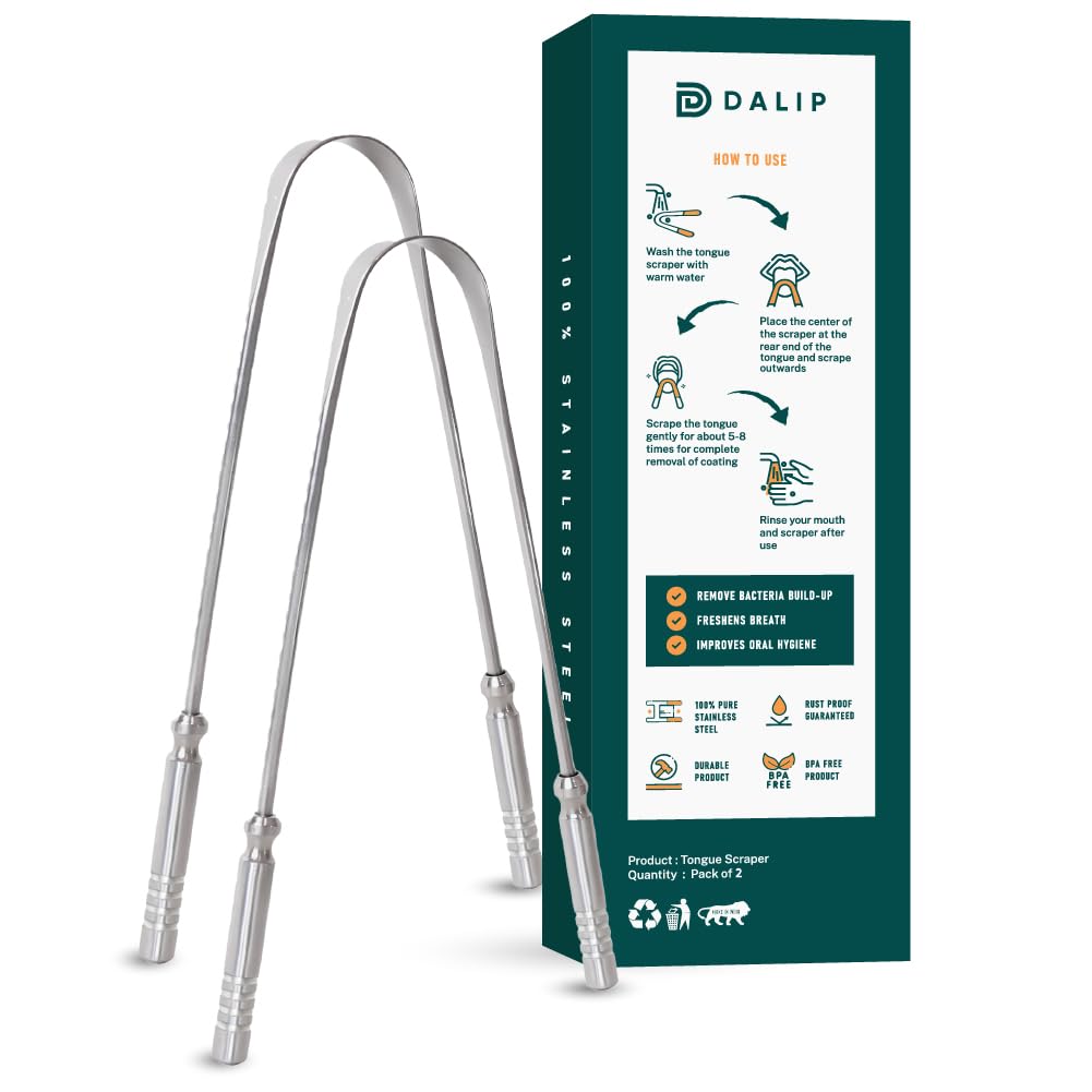 Dalip Tongue Scraper for Adults with Ergonomic Non-Slip Handle, Stainless Steel Tongue Cleaner, Reduces Bad Breath, Easy to Use Oral Care & Hygiene Tongue Scrubber (Pack of 2)