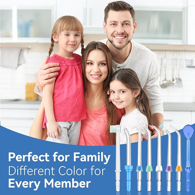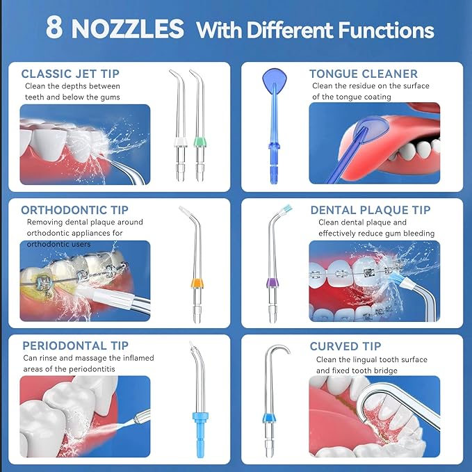 - Replacement Heads for Waterpik: The set comes with 8pcs various color coded replacement accessories for Waterpik, includes 2x Classic Jet Tips, 1x Tongue Clean,1x Orthodontic Tip, 1x Periodontal Tip, 1x Plaque Seeker Tip, and 1x Brush tip,1 Curved hook Tip, which meet your different cleaning needs.