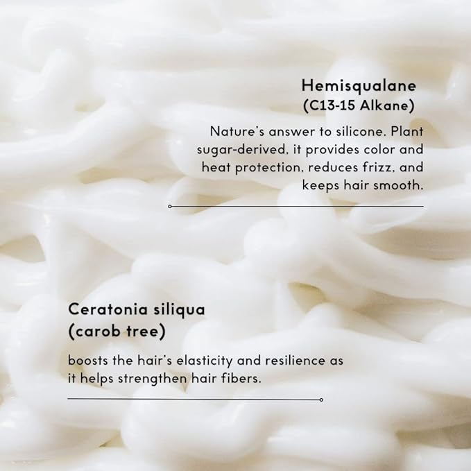- Hero Ingredients: Hemisqualane: provides color and heat protection, reduces frizz, and keeps hair looking and feeling smooth. Bisabolol: offers natural skin-soothing benefits. Ceratonia siliqua (carob tree) extract boosts the hair’s elasticity and resilience as it helps strengthen hair fibers. Moringa oleifera (horseradish tree) extract provides the hair with protection against pollution and UV rays. Squalane nourishes locks, restores luster, and adds instant glass-like shine and softness.