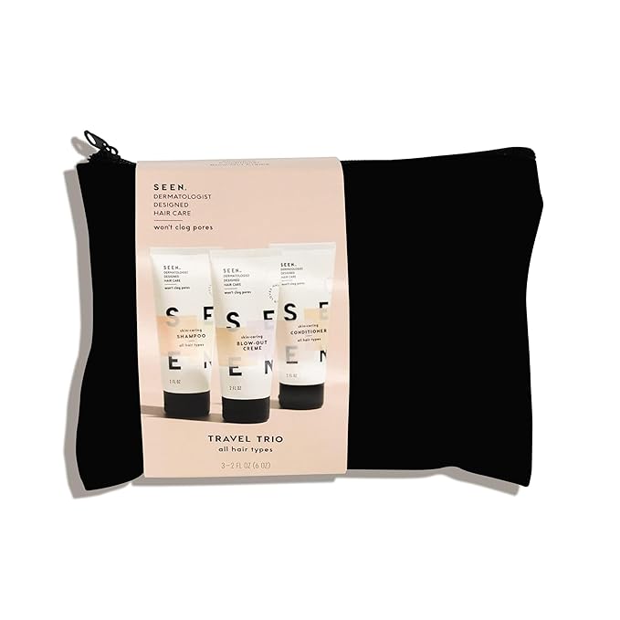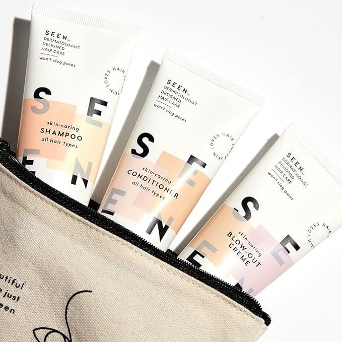 - TSA-approved mini-sizes of SEEN’s fragrance-free Shampoo, Conditioner, and Blow-Out Creme for stronger, smoother, healthier hair