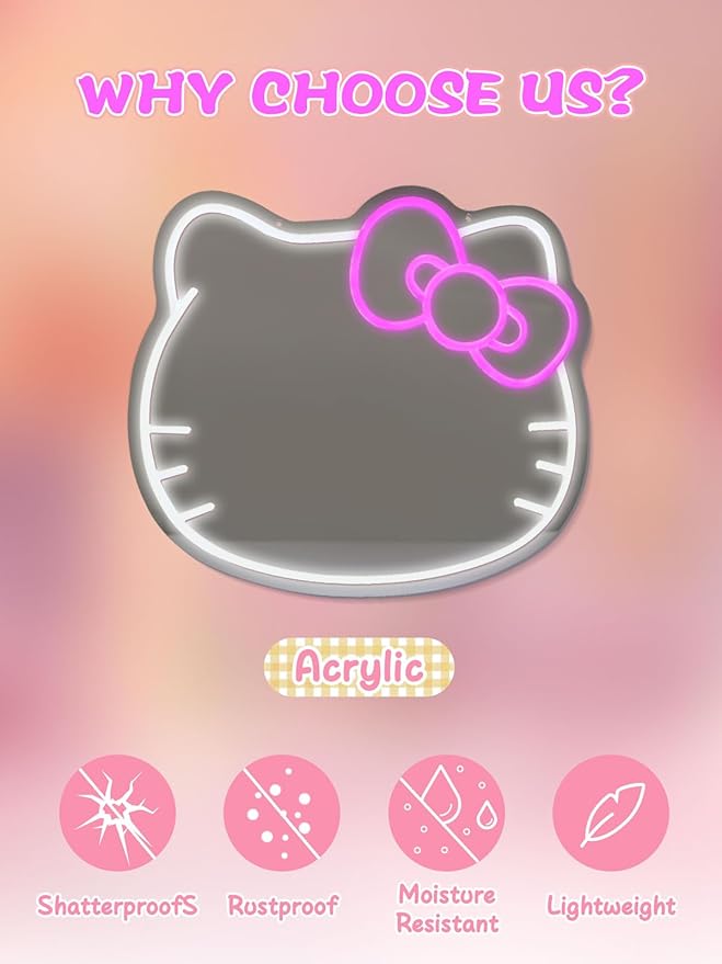 - 【Neon Signs for Wall Decor】Illuminated by LED neon lights, this pink room decor vanity mirror displays an adorable cat and cute hair clips, providing not only ample light for makeup and shaving but a unique room decoration. The Neon Sign mirror room decor design adds a touch of romance to any environment.