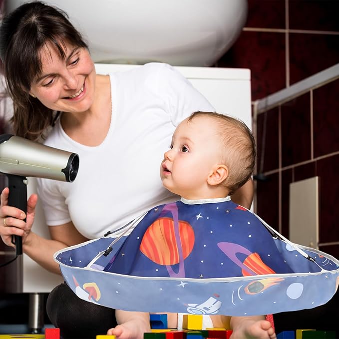 - Umbrella-Shaped Deep Groove Design: The deep groove adopt a unique umbrella-shaped deep groove design, which can effectively avoid hair from falling to clothes or the floor, making cleaning easier and faster. The bright and lively space theme pattern on the kids barber cape not only makes children feel happy, but also makes them more comfortable when they have a haircut