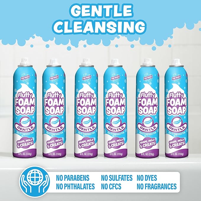 - FOAM SOAP 6 PACK: Kids Bath Foam Soap Set includes (6) Extra Gentle 8oz cans! (3) of the cans feature a "doddle" nozzle (writing & drawing) and (3) of the cans feature a "cloud" nozzle (shaping & molding).