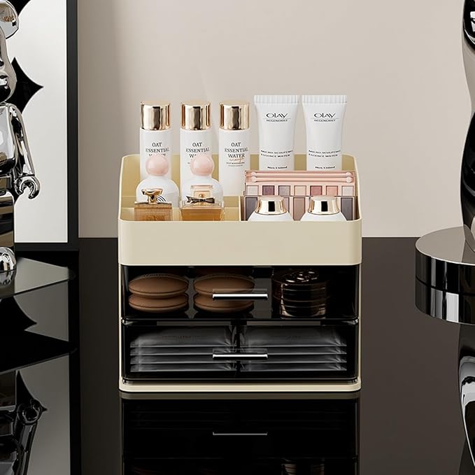Makeup Organizer for Vanity,Vanity Organizer with 2 Drawers,Makeup&skincare Organizers Countertop,Cosmetic Display Case,Vanity Storage Box(Cream)