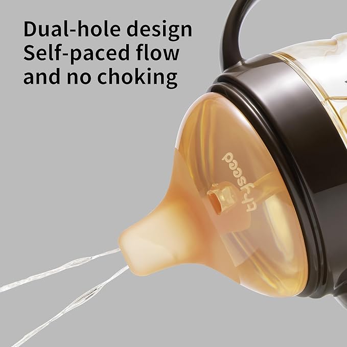 - Easy Transition From Bottle to Cup: German made bite-proof silicone spout, soft as mom's breast, featuring a bigger air vent, easy to suck, gentle on teeth and gum. Localized thickening design for better support, prevents nipple sagging. Best choice for breastfeeding babies, making weaning off bottle easier