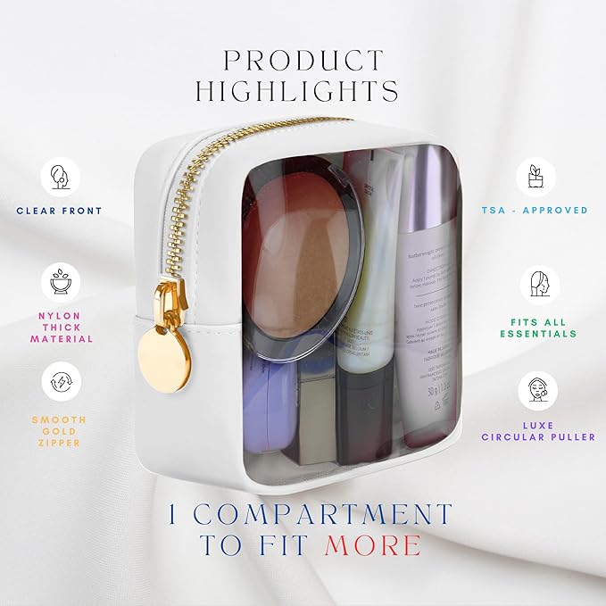- PREMIUM QUALITY: The clear makeup bag for purse is made of premium nylon material with a luxurious gold zipper pouches.