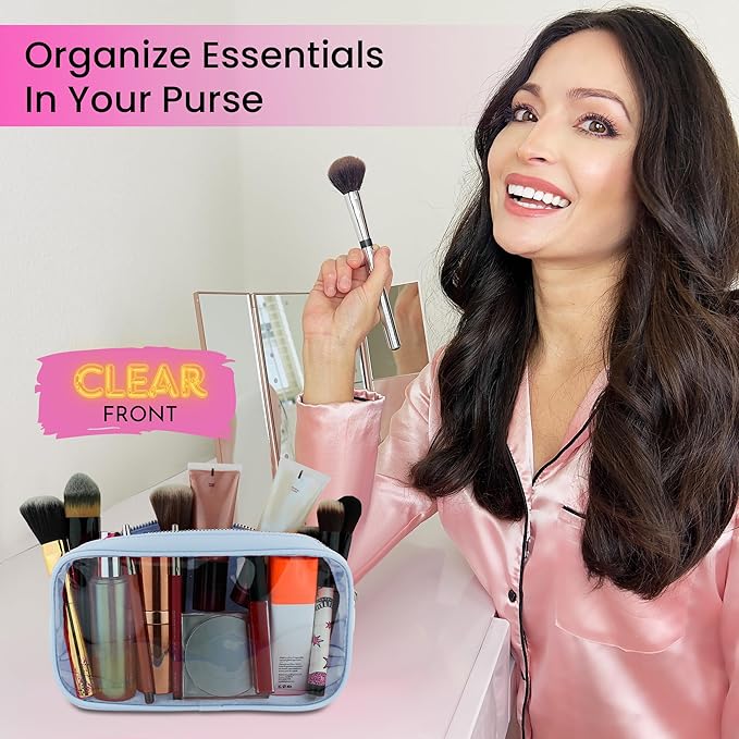 - Clear Makeup Bags With Zipper : Size 9.5"x2"x5". The purse organizer pouches with zipper has a single pocket for extra space to fit all your beauty, purse necessities and accessories.