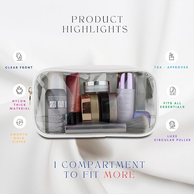 - PREMIUM QUALITY: The clear makeup bag for purse is made of premium nylon material with a luxurious gold zipper pouches.