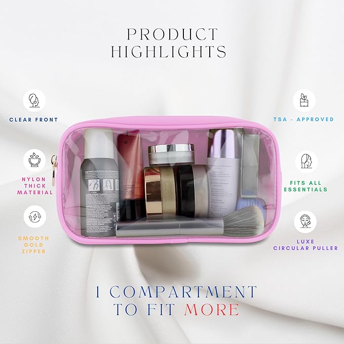 - PREMIUM QUALITY: The clear makeup bag for purse is made of premium nylon material with a luxurious gold zipper pouches.