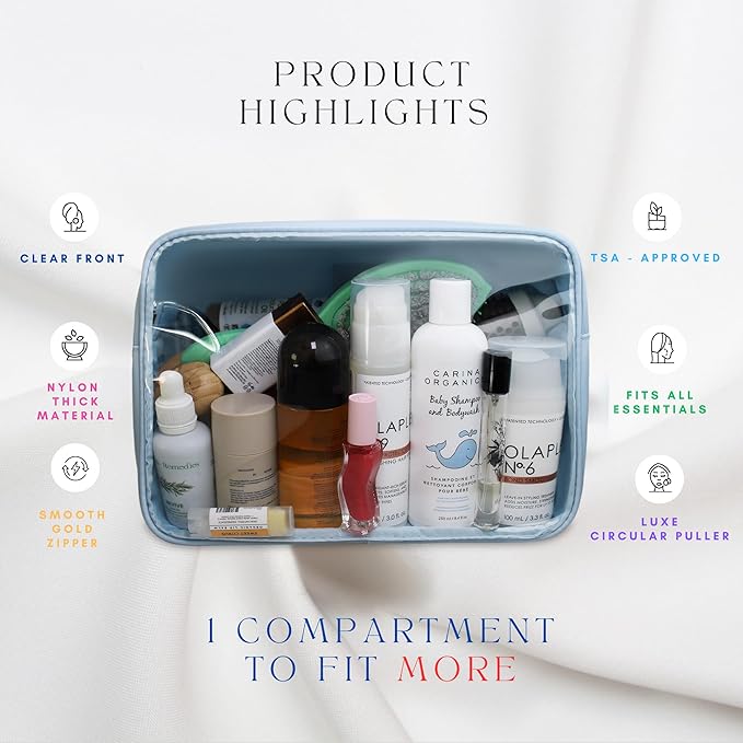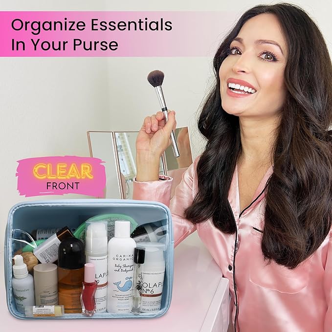 - WATER RESISTANT: The clear makeup bag for travel is water-stain proof nylon pouch material. Helps protect your beauty, cosmetics and toiletries safe from water spilling accidents.