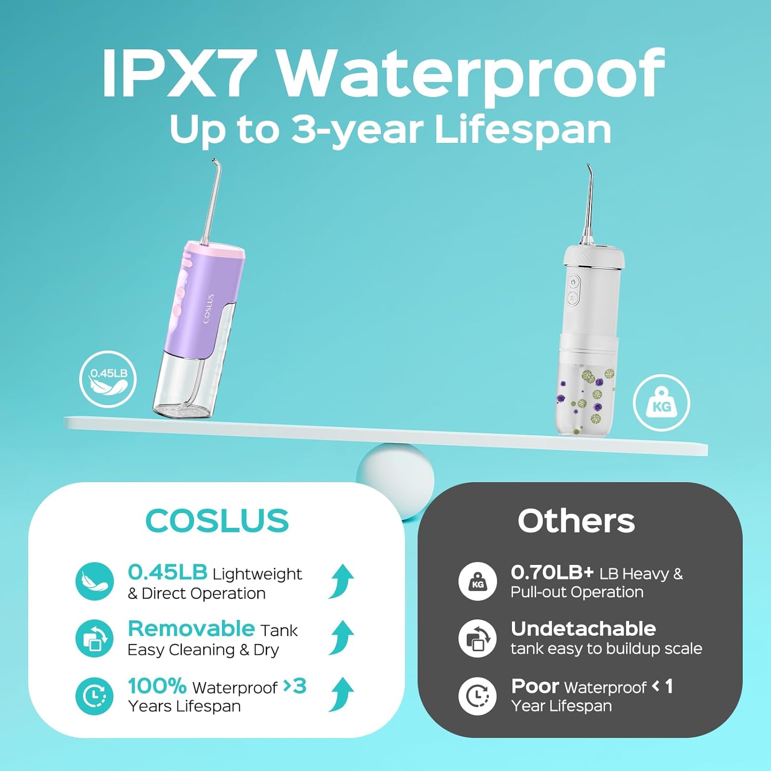 COSLUS Mini Water Flosser for Travel: Portable Compact Design, Cordless Oral Irrigator with 4 Jet Tips, Removable Tank & IPX7 Waterproof for Braces, Sensitive Teeth & On-The-Go Use, Pink Purple, T40