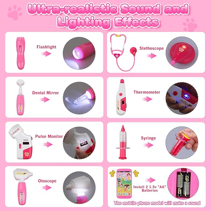 - Multifunctional Doctor Kit for Kids: This doctor set includes a variety of medical and pet care tools, and also has a cute fluffy dog toy, allowing children to experience the fun of being a doctor and taking care of pets. It is a perfect toy for children who dream of becoming a doctor or nurse and is also great for children who like to play pretend games