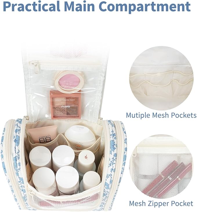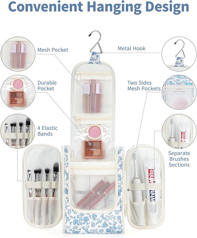 Narwey Hanging Toiletry Bag Women Travel Makeup Bag Organizer Toiletries Bag for Travel Size Essentials Accessories Cosmetics (Medium,Little Blue Flower)