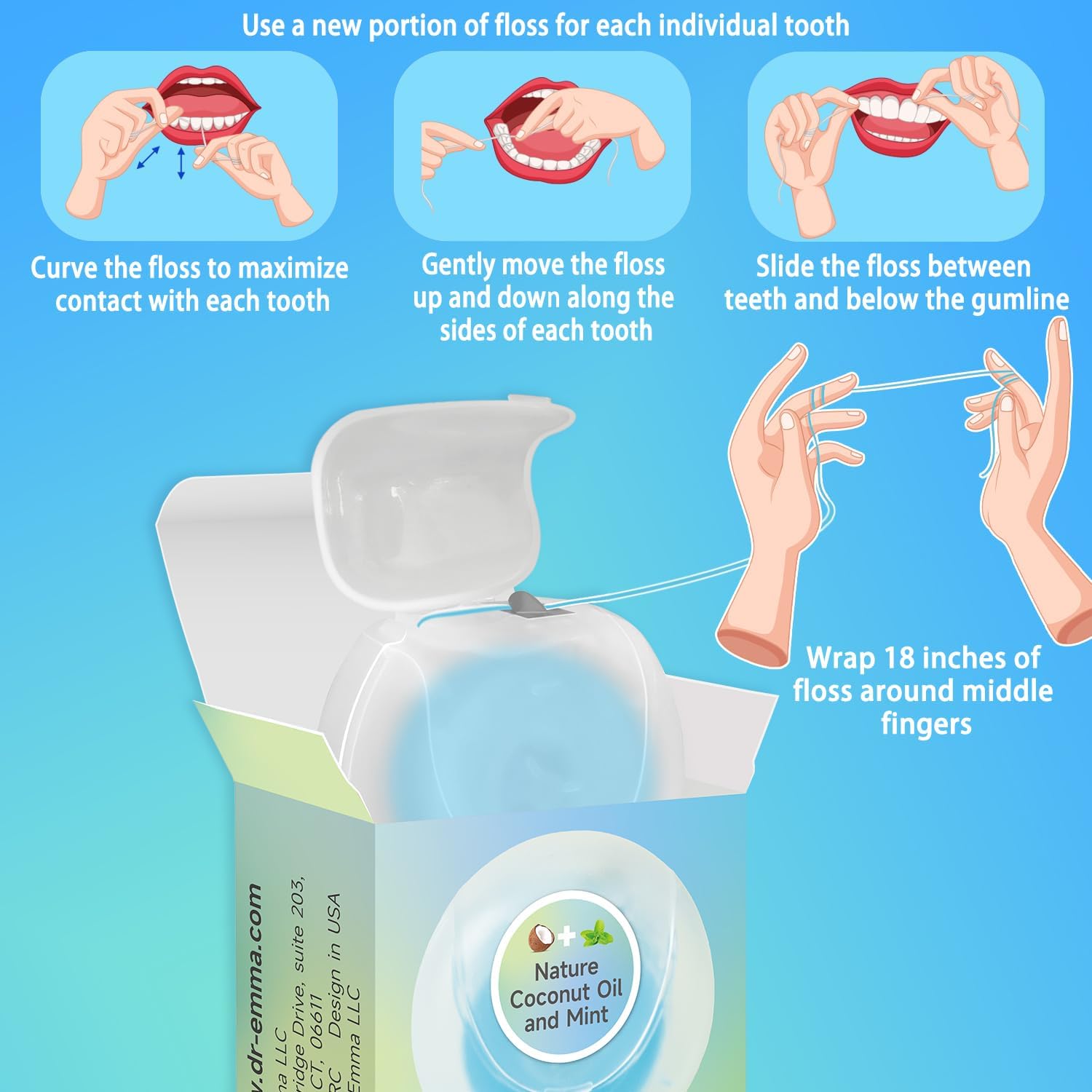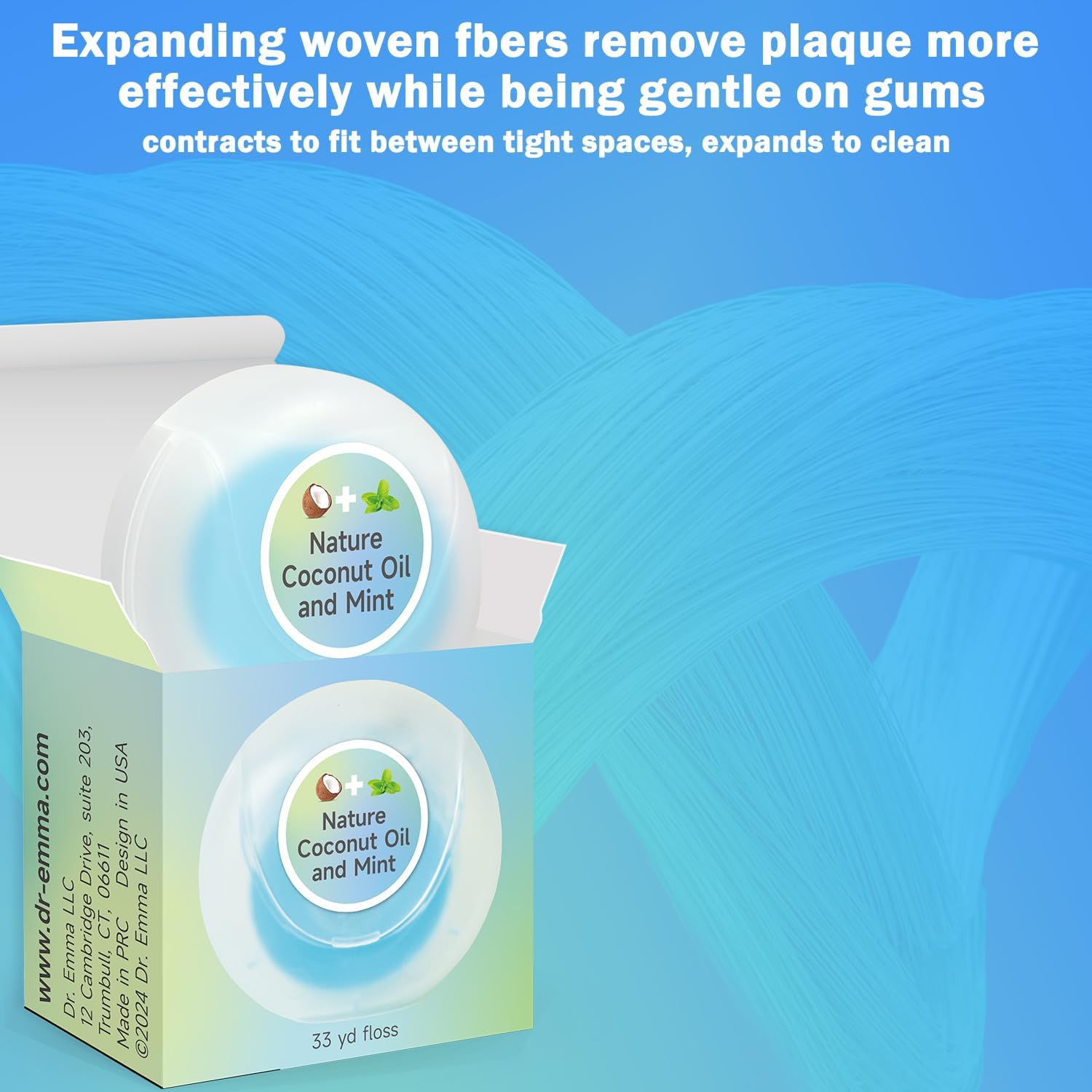 Dr. Emma Woven Dental Floss Coconut Oil Infused Expanding Dental Floss, Oral Care Stretchable Floss, Mint 33yd Blue, Pack of 4