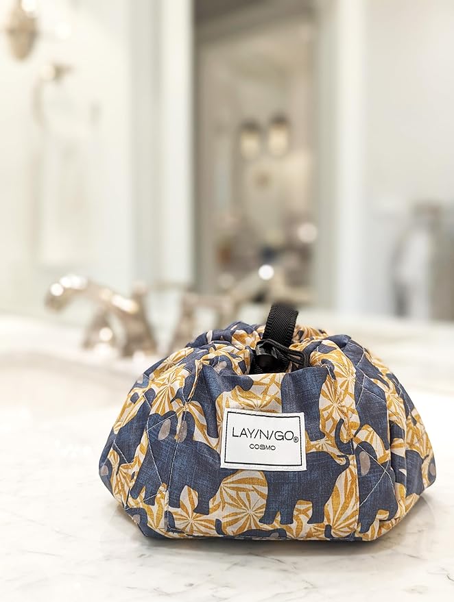 Lay-n-Go Cosmo Layflat Drawstring Cosmetic & Makeup Bag Organizer - Portable Drawstring Bag w/Zipper Pocket, Makeup Loops & More - Durable, Machine Washable Costmeic Bag for Travel (20", Elephants)