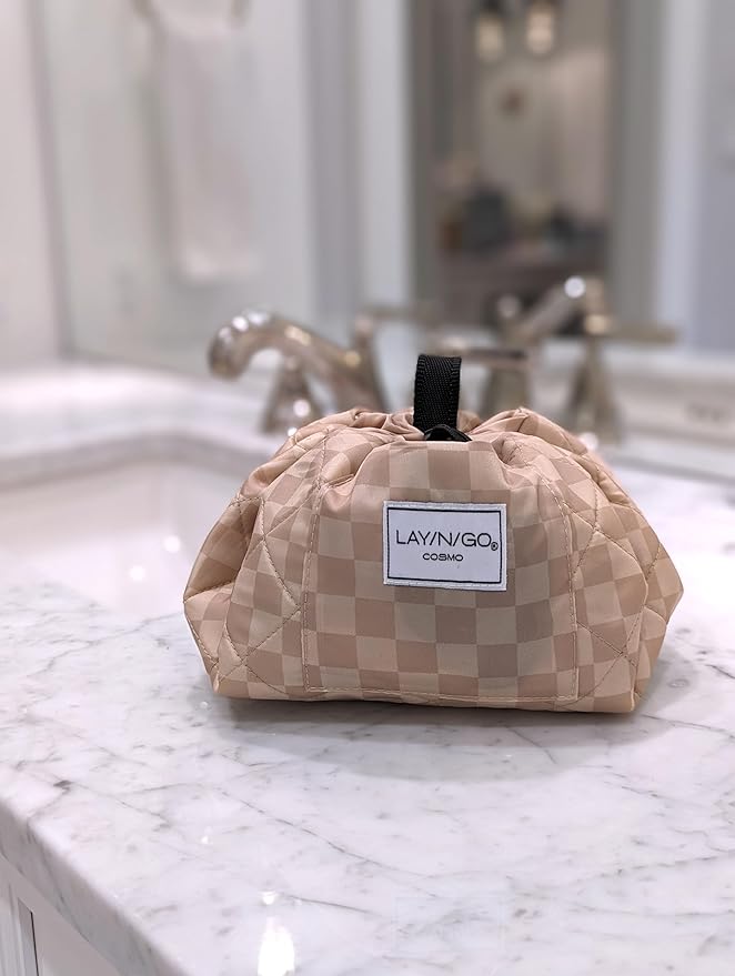 Lay-n-Go Cosmo Layflat Drawstring Cosmetic & Makeup Bag Organizer - Portable Drawstring Bag w/Zipper Pocket, Makeup Loops & More - Durable, Machine Washable Toiletry Bag for Travel (20", Checked)