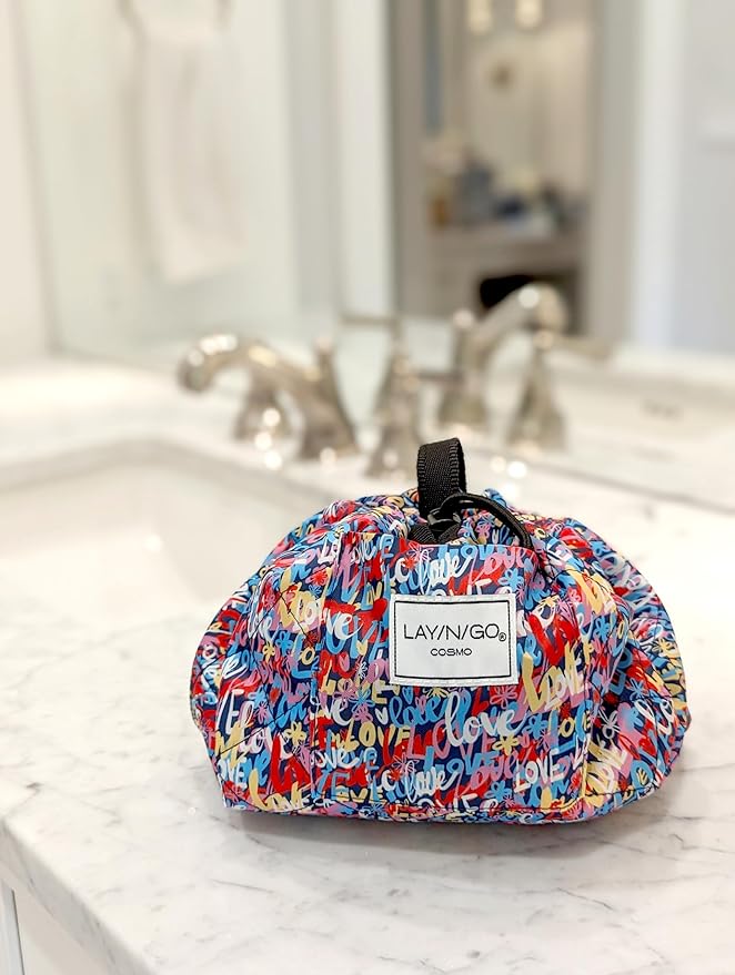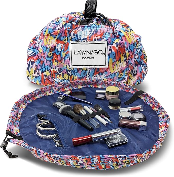 Lay-n-Go Cosmo Layflat Drawstring Cosmetic & Makeup Bag Organizer w/Zipper Pocket, Brush Loops & More, Cinch to Close, Lay Flat to Use, Durable, Machine Wash, Travel Toiletry Bag (20", Love)