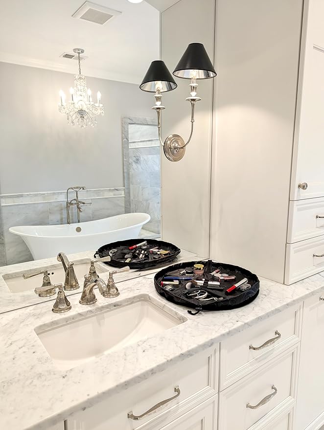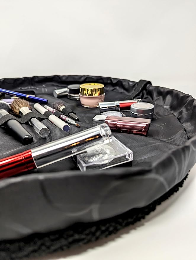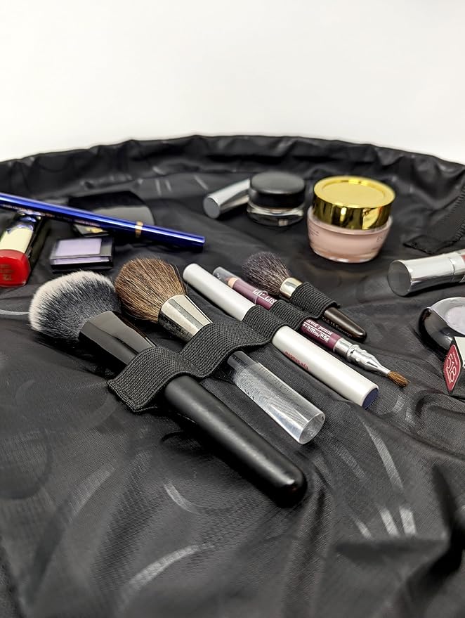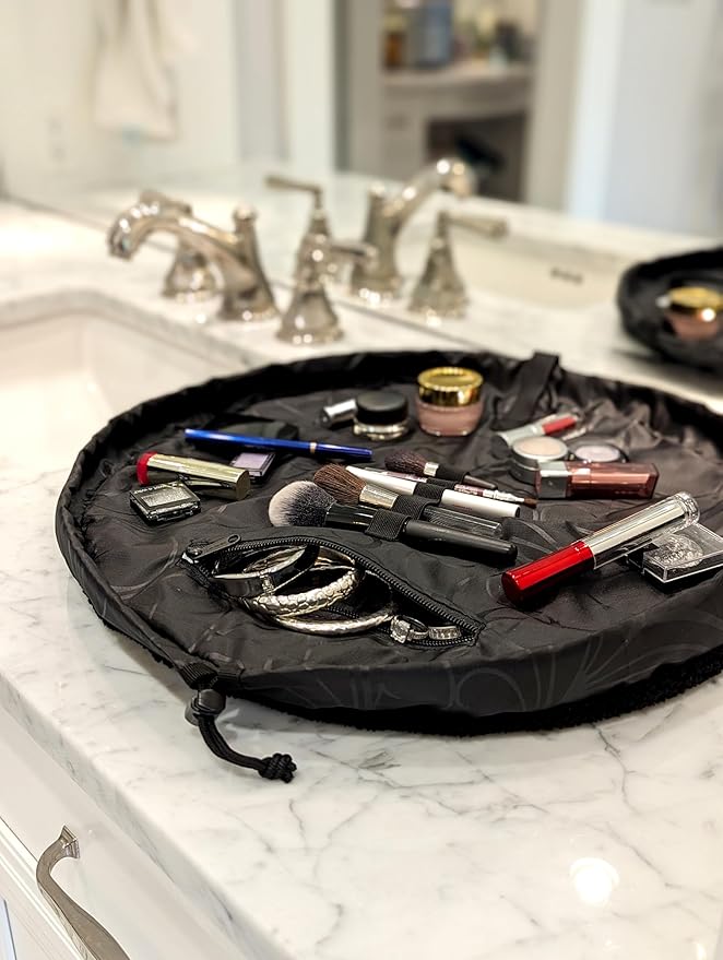 - FAST CLEANUP, NO MESS: Lay flat to instantly access all your makeup, then cinch closed for effortless cleanup – no more digging through cluttered bags or bathroom counters.