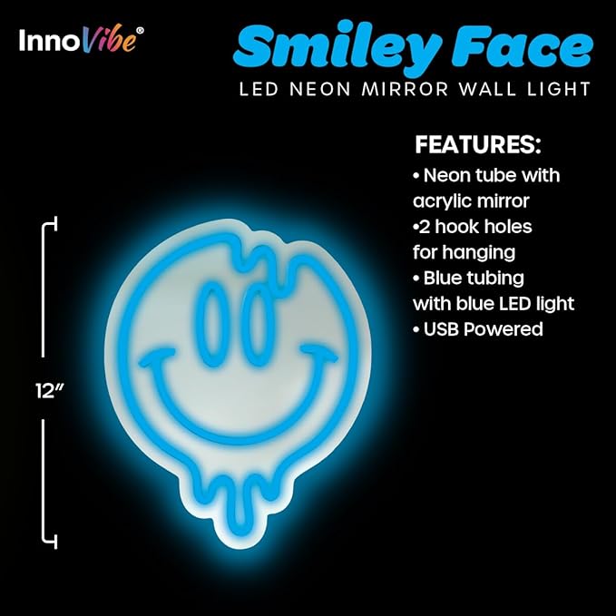 - Playful Design: The innoVibe Blue Smiley Face Shaped Neon LED Mirror Wall Light features a fun smiley face neon sign design that adds a whimsical touch to any neon room decor, perfect for brightening up bedrooms and play areas.