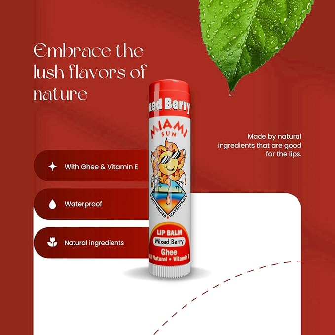 Miami Sun Natural Ghee Lip Balm, Hydrating Lip Treatment with Shea Butter & Beeswax, Organic & Non-Toxic, Best for Dry, Chapped Lips - Moisturizing, Healing, Chemical-Free Care (12 Count, Mixed Berry)