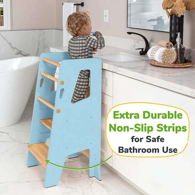 - BUILT FOR STABILITY – Unlike basic kitchen step stools for toddlers, our wide, anti-tip base and sturdy frame prevent wobbling. It’s the toddler standing tower parents trust for balance on hardwood or tile floors.