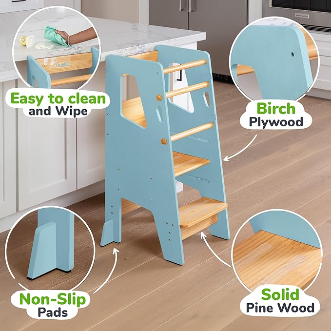 OCODILE Toddler Standing Tower - Adjustable Height Toddler Kitchen Stool Helper - Ideal Kids Kitchen Step Stool for Learning New Skills - Updated Design with Safety Feet - Blue