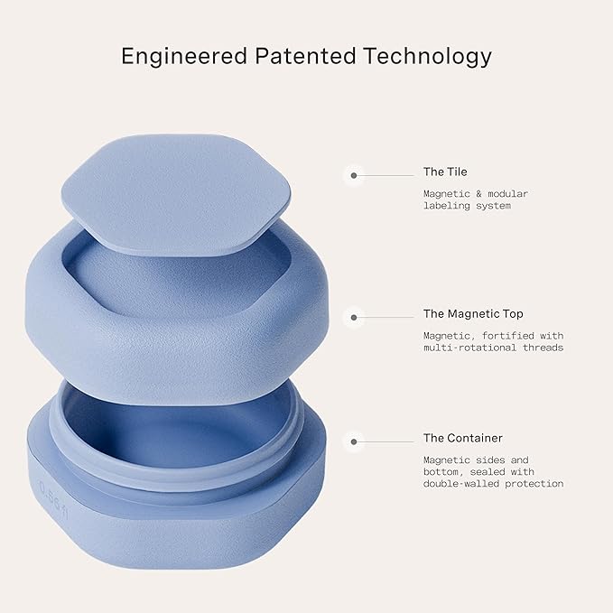 - PATENTED MAGNETIC DESIGN - Designed for seamless storage, our travel capsules feature a magnetic design that connects each container vertically or horizontally. They include magnetic labels that seamlessly swap between The Flex Small, The Flex Medium, and The Flex Large Capsules.