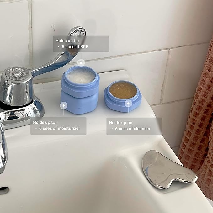 Cadence Travel Containers Basic Skincare Set - Magnetic Containers with Lids,Carry On Travel Essentials For Women/Men - 3 Small Capsules (0.56oz) - Cleanser, Moisturizer & Sun-Icon Labels - Pacific