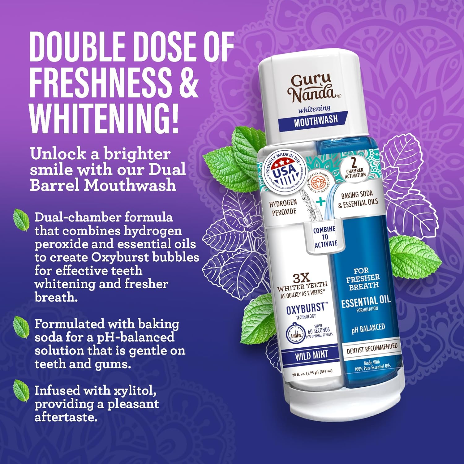- ADVANCED ORAL CARE SOLUTION: GuruNanda Whitening Mouthwash is a fluoride-free, dual-chamber formula based on Ayurvedic principles. Hydrogen peroxide, natural ingredients, and vitamins work together to help remove bad breath and teeth stains for a refreshed and clean mouth. The dual-barrel mouthwash supports oral hygiene, helps reduce gum problems, and promotes whiter teeth through its Oxy-burst technology. A holistic solution to oral health, it is a perfect way to care for your mouth.