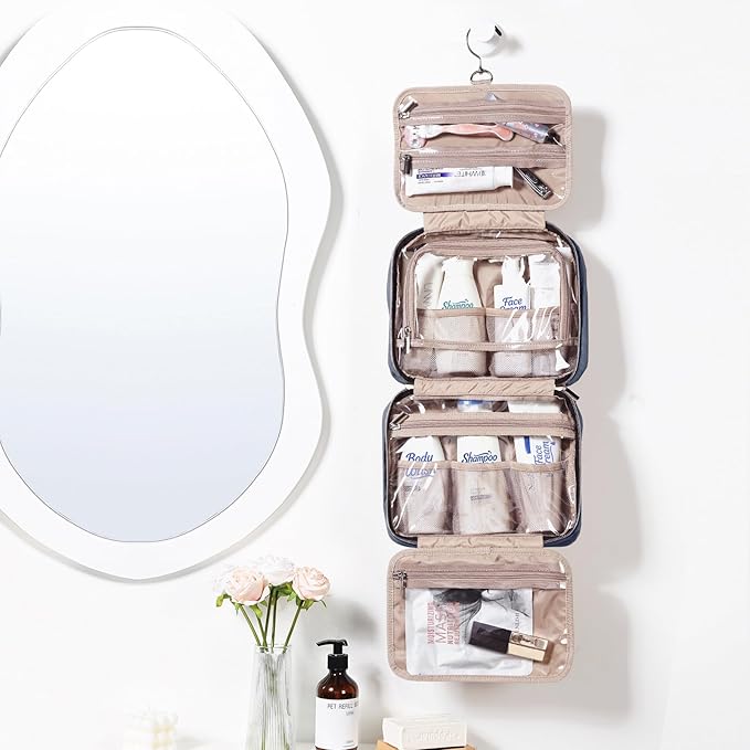 - ESSENTIAL ARRANGEMENT - A hanger to hook allows you to hang the toiletry bag almost anywhere for easy accessibility. Quick-access front pocket for secure storage