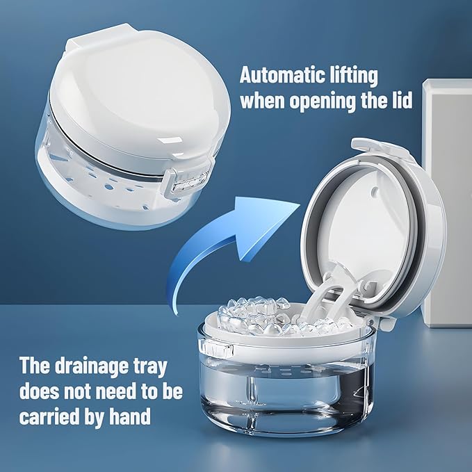- Travel Case: Crafted from premium ABS plastic and food-grade silicone, non-toxic, scratch-resistant. Enhanced silicone sealing ring ensures no leaks when the case is closed. The extra storage container with mirror on the top is designed to conveniently hold effervescent tablets, dental floss sticks, braces extractor, and cleaning brushes. The magnetic design ensures that items stay securely in place, preventing them from falling out when the lid is opened.