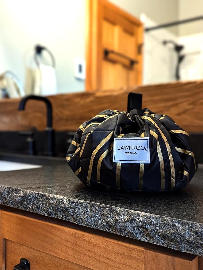 Lay-n-Go Cosmo Drawstring Cosmetic & Makeup Bag Organizer - Portable Drawstring Makeup Bag w/Zipper Pocket, Makeup Loops & More - Durable, Machine Washable Toiletry Bag (20", Black & Gold)