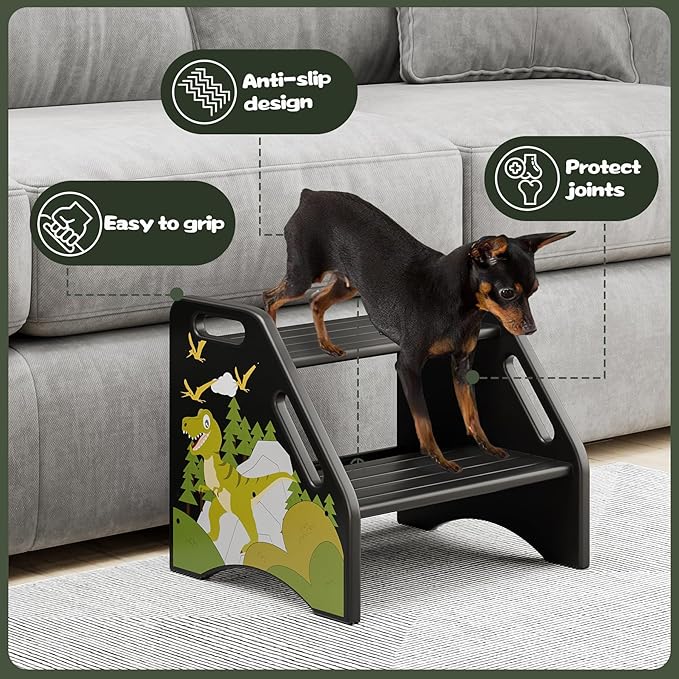 AMBIRD Toddler Step Stool, Dinosaur Wooden Two Step Stool for Kids with Non-Slip Pads, Portable Potty Training Stool with Handles for Bathroom, Sink, Kitchen, Bedroom