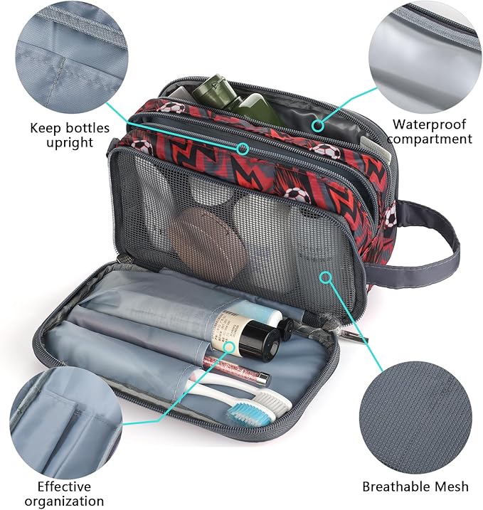 Kids Toiletry Bag for Boys, Travel Toiletry Bag for Little Young Boys Waterproof Hanging Wash Bag Toddler Traveling Toiletries, Red Soccer Balls