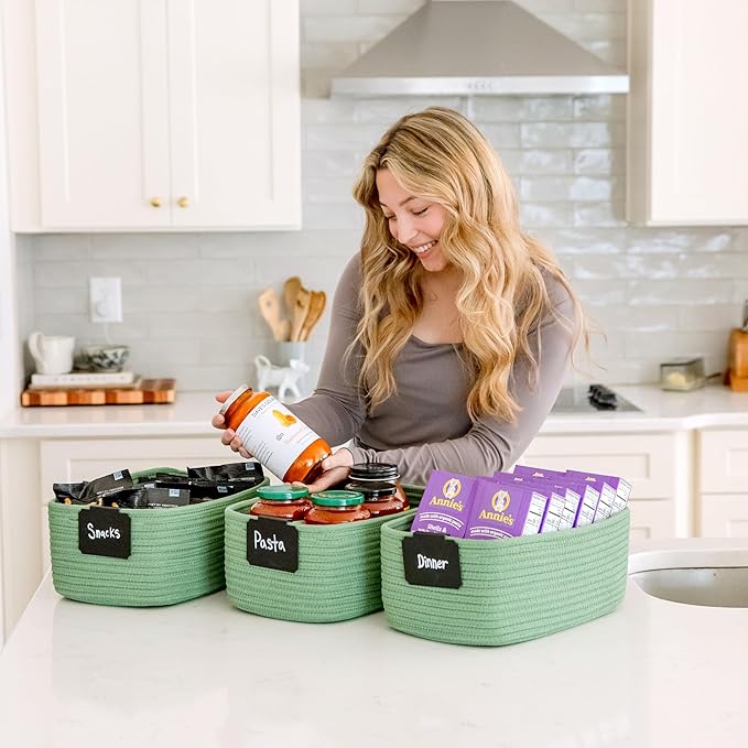 - Safe, Natural Cotton Organizer Bins: Crafted from the highest quality material in the market, our storage bins are oh-so-sturdy (and cute) and ready to take on little humans. They’re 100% safe, so you can rest easy if teething toddlers take a nibble. Reinforced Hidden Handles: Now you see ‘em, now you don’t! With completely hidden handles that blend seamlessly into the rope basket, you’ll be the Houdini of home organizing. They’re even double-stitched and reinforced for extra heavy loads!