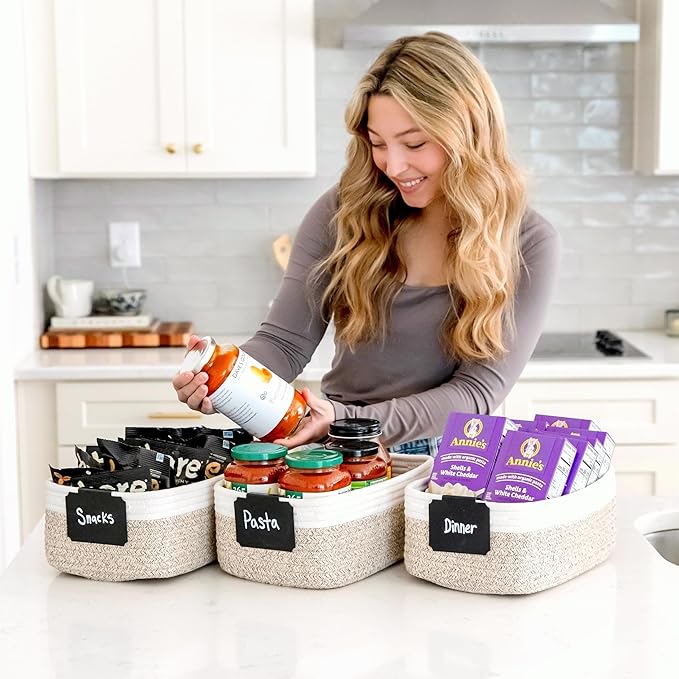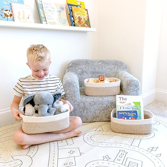 - Safe, Natural Cotton Organizer Bins: Crafted from the highest quality material in the market, our storage bins are oh-so-sturdy (and cute) and ready to take on little humans. They’re 100% safe, so you can rest easy if teething toddlers take a nibble. Reinforced Hidden Handles: Now you see ‘em, now you don’t! With completely hidden handles that blend seamlessly into the rope basket, you’ll be the Houdini of home organizing. They’re even double-stitched and reinforced for extra heavy loads!