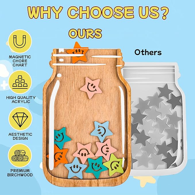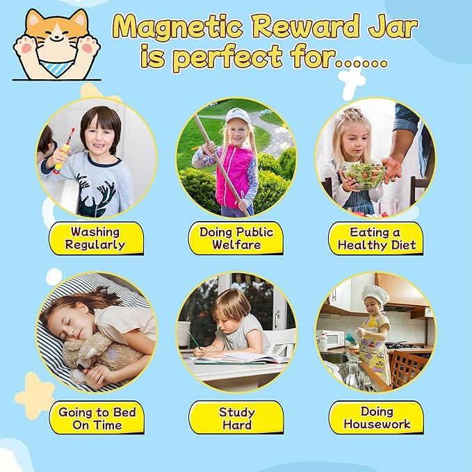 - Reward Chart for kids:Made from high-quality and child-safe materials, the star reward jar is suitable for any magnetic surface including whiteboards and fridges. This reward jar is perfect for both teachers and parents, helping children build strong habits and stay motivated