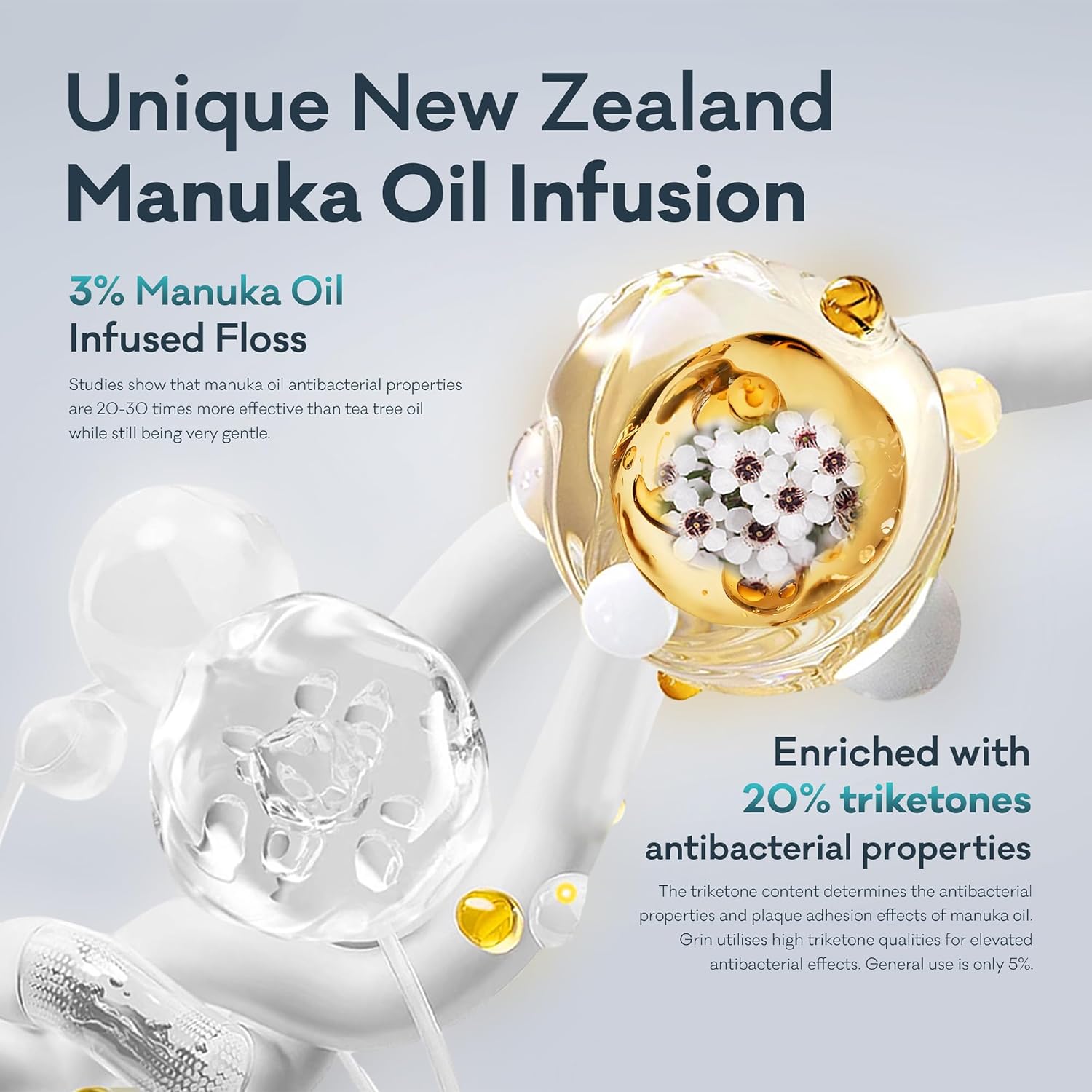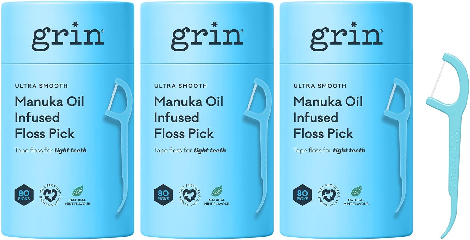 - ULTRA CLEAN Floss Sticks for Adults: Grin tooth floss picks provide an elevated flossing experience, contains three canisters with 80 Manuka Oil infused flossing picks (240 toothpick floss total). Perfect for daily oral care, they help clean between teeth and along the gum line.