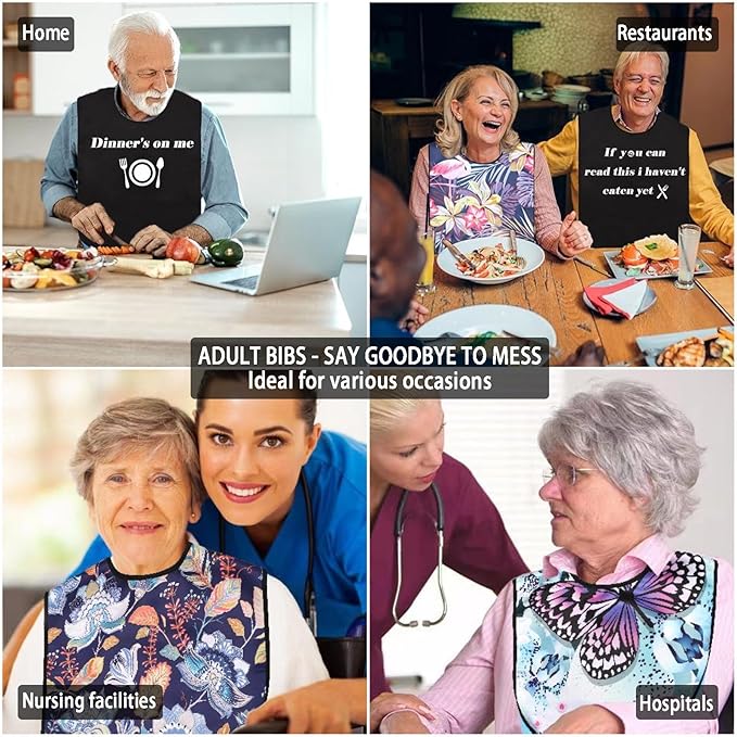 - ADULT BIBS WITH FUNNY WORDS: Adult bibs with humor are a game changer. It eliminates the dullness associated with traditional bibs and keeps you looking neat and fun. Whether you're at dinner or other messy activities, you'll stay clean and dry away from the mess every time.