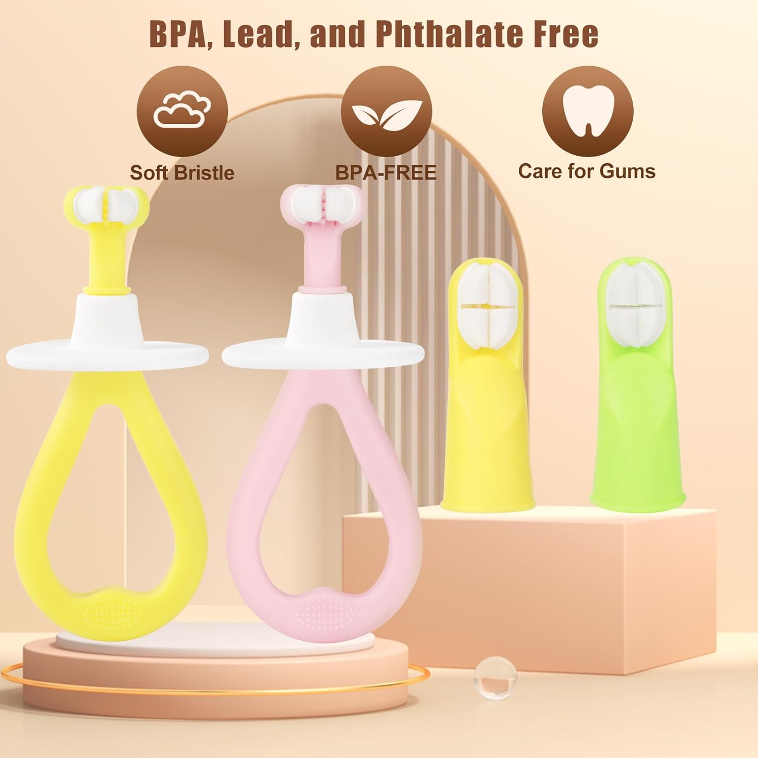 - Three-Sided Toddler Toothbrush: Our finger toothbrush for toddlers 1-3 features a triple-angle three-sided brush that effectively cleans and massages all sides of your child's teeth and gums simultaneously, ensuring a thorough clean with every use. Besides. It's gentle on sensitive teeth and tender gums, ensuring a comfortable brushing experience for your baby.