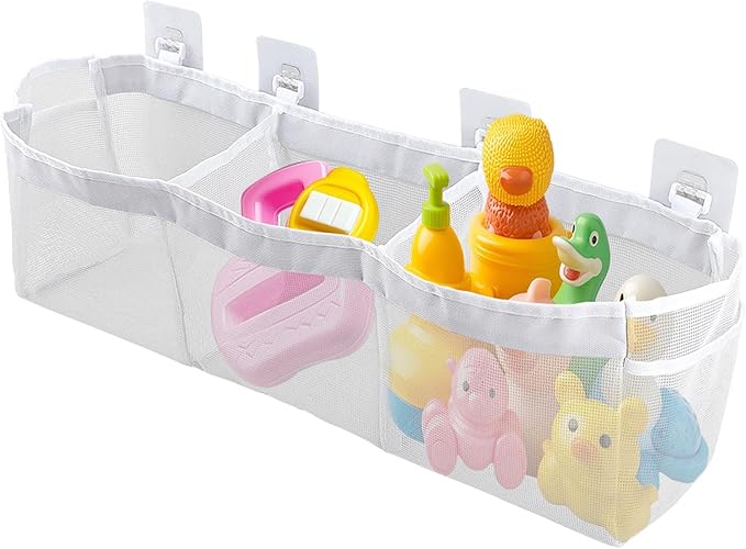 - 【3 COMPARTMENT DESIGN】There are 3 separated pocket bag is great for storing sponges, shampoo, brushes and any other trinkets your little one has to have in the bath.Save time cleaning your bathroom by storing all the toys, lotions and potions up off the surfaces.