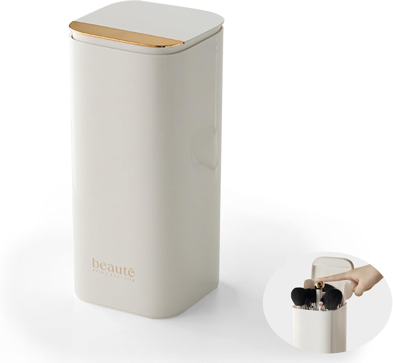 DASITON Makeup Brush Holder with Lid,4 Slots Makeup Brush Organizer,Automatic Lifting Makeup Cosmetics Organizer,for Vanity Decor,Bathroom Countertop,Dustproof Cosmetic Brushes Container(White)